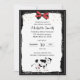 Neutrale Kuh Print Baby Shower Einladungen mit einem rot-schwarz gepunkteten Bug und Kuh Muster Hintergrund. Niedliche Grafik eines Kalbes.