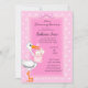 Rosa Punkt Hintergrund mit einem Storch mit zwei Mädchen. Fügen Sie Ihre Party-Details hinzu, um die perfekte Babydusche-Einladung anzupassen.