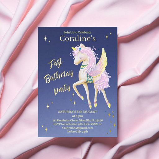 Flacheinladungen Karten für Ihren ersten Geburtstag, mit einem Bild eines sanften Einhorns mit Flügeln.