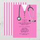 Kreative Doktoranden-Graduiertenparty mit rosafarbenen Klinikscheuchen und Stethoskop. Editieren Sie den Text, um eine einmalige Ankündigung der Party Einladung oder des Doktorgrades zu erstellen.
