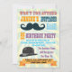 Angesagter und lustiger Schnurrbart-Geburtstagsfeier mit Schnurrbart, Bowler derby hat Hut und Sonnenburstposter wie verblasster antiker Hintergrund mit fett grauen Schriftart. Gut für jedes Alter oder Geschlecht. Ändern Sie die Formulierung "Geburtstagsparty" in jede Art von Party, die Sie möchten, wie Bachelor oder Junggeselinnen-Abschied. Handgezeichnete Abbildung von McBoo. Bitte kontaktieren Sie mich bei Fragen, Änderungen oder Problemen!