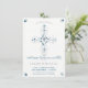 Diese 4,5" x 6,25" Einladungskarte der Ersten Heiligen Kommunion enthält einen grauen Kalice und Wafer (heilige Kommunion), umgeben von einem verzierten Kreuz und den Worten "Erste Kommunion", die in einem eleganten Schriftart geschrieben sind. Ideal für den besonderen religiösen Anlass Ihres Jungen, kann es nach Ihren Wünschen mit dem Namen und den Veranstaltungsinformationen Ihres Kindes angepasst werden.