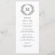 Wappen Mongram Wedding Menu mit Schwarz und Weiß Blütenblättern. Mit diesem schlichten, eleganten, zeitlosen, schwarz-weißen 4"x 9" Hochzeitsmenü schaffen Sie den perfekten Empfang! Einfach, elegant, einfach perfekt; es verfügt über einen handgezeichneten, blumengeschmückten Kranz, der um ein Serifenmonogramm zur Hochzeit umringt. Es ist personalisiert in eleganter Typografie und mit klassischer Kalligraphie betont.