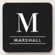 Das klassische und moderne Design des personalisierten Getränke-Untersetzer besticht durch ein männliches und dennoch elegantes Serif-Monogramm, das mit dem Nachnamen Ihrer Familie kombiniert wird. Hinzu kommen einfache horizontale Streifen vor einem gemusterten Hintergrund aus schwarzem Marmor. Weiße Text- und Designfarben können so modifiziert werden, dass sie sich perfekt mit Ihrer Wohngestaltung abstimmen.