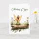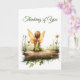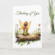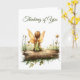 Eine einsame, junge Fee mit goldenen Flügeln, die ein grünes Kleid tragen und von Wildblumen umgeben sind, sitzt auf einem Stein und blickt in die Ferne. Die Innenseite der Karte ist leer, damit Sie Ihre persönliche Nachricht schreiben können.