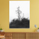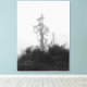 Ein einsamer, blättriger Baum, der von einem dichten Nebel am Morgen umsäumt wird, silhouettiert gegen einen blass bedeckten Himmel, umgeben von wildem Unterholz, das ein Gefühl von ruhiger Einsamkeit und Geheimnis weckt