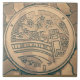 Kennzeichnet ein antikes Kanaldeckelgitter, das in einer alten Kopfsteinstraße nestled ist. Rustikal und mit Weltscharme verfeinert. Dieses stellt eine orientalische Szene dar, die eine Pagodenlampe, eine gebogene Brücke und Kirschblüten kennzeichnet.