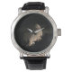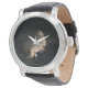 Die Armbanduhr ist mit einem Moon im Gesicht, schwarzem Lederarmband und silberfarbenem Rücken ausgestattet.