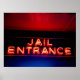Rote Neonleuchten, die den Eingang des Gefängnisses buchstabieren, leuchten an der Betonwand.