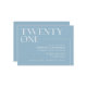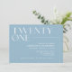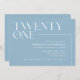 Moderne Einladungen zum 21. Geburtstag mit der großen Überschrift "21" Text in einem Akzent Schriftart. Das Design ist nicht im Zentrum auf einem hellblauen Hintergrund.