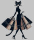 Eine modische, anthropomorphische Katze wird mit mehreren Einkaufstüten dargestellt, wobei auf einem der Säcke der Begriff "Retail Therapy" geschrieben ist. Das Stilkraut ist geschmackvoll gekleidet und trägt eine Sonnenbrille, die eine raffinierte Atmosphäre ausstrahlt.