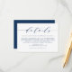 Lass deinen Gästen mit dieser individuell gestaltbaren Hochzeitskarte über deine Hochzeitsdetails Bescheid. Es zeichnet sich durch einfache Typografie, moderne Kalligraphie und eine einfache Grenze aus. Personalisieren Sie diese elegante Hochzeitskarte, indem Sie Ihre Hochzeitsdetails hinzufügen. Diese blaue Detailkarte ist ideal für Hochzeiten, Brautpartys und vieles mehr.
