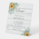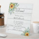 Ein modernes, elegantes Hochzeitsprogramm, Zeitleiste. Rustikales weißes Holz als Hintergrund. Mit Sonnenblumen dekoriert, grüne, wasserfarbene Eukalyptuspflanzen. Personalisieren und fügen Sie Ihre Namen und Hochzeitsdetails. Schwarze Buchstaben. Wenn Sie mehr Text haben, ist es möglich, den Zeilenabstand zu verringern.