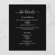 Eine moderne, elegante Hochzeitsdetails/Programm/Zeitleiste. Ein schwarzer Hintergrund. Personalisieren und fügen Sie Ihre Namen und Hochzeitsdetails. Weiße Buchstaben. Text auf beiden Seiten. Fügen Sie Ihre Hochzeitswebsite url zum QR-Code hinzu. 1 Blatt = 1 Programm, mit der Kante bis Kante bedruckt.