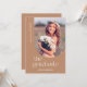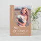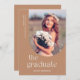 Diese moderne Abschluss-Fotokarte besticht durch elegante Typografie und ein Foto aus dem Innern. Auf der Vorderseite ist "Der Absolvent" in einem einfachen und trendigen Schriftart unter dem Foto geschrieben. Der Name des Absolventen wird unter der Typografie zentriert, während die Schule und das Abschluss des Absolventen vertikal entlang der links Seite des Fotos geschrieben werden. Die Typografie ist helle Creme vor einem verblassten Terrakotta Hintergrund. Auf der Rückseite der Abschluss-Karte befindet sich eine optionale Vorlage zum Hinzufügen von Gruppenangaben für Graduiertengruppen.