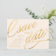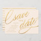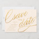 Diese einzigartigen, modernen speichern die Daten mit extravaganten Skripten in einem Imitat Goldfolie-Effekt auf einen süßen Champagner-farbenen Hintergrund, mit den Einzelheiten der Hochzeitsankündigung in Weiß. Der Backer zeichnet sich durch ein trendiges goldenes Streifen-Muster aus. Ändern Sie die Hintergrundfarbe mit dem Tool "Anpassen"!