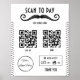 Diese einzigartige schwarze Scan zu zahlen Zeichen-Poster sind anpassbar und Ihre Business-Informationen ist einfach tot hinzufügen **auch als Sofortdownload**. Mit 2 QR-Codes können Sie Venmo, PayPal, Cashapp oder jede andere Zahlungsanwendung wählen, um auf Ihr Zeichen zu verlinken, damit die Kunden für den Kauf einfach bezahlen können. Die Schnurrbart-Kollektion eignet sich am besten für Barbierläden, Shops und Marken, die lustig und spielerisch sind. Das ist ein Plakatstil, den Sie in einem Poster, einem Rahmen, an der Wand oder als flattiges Poster auf einem Tisch platzieren können.