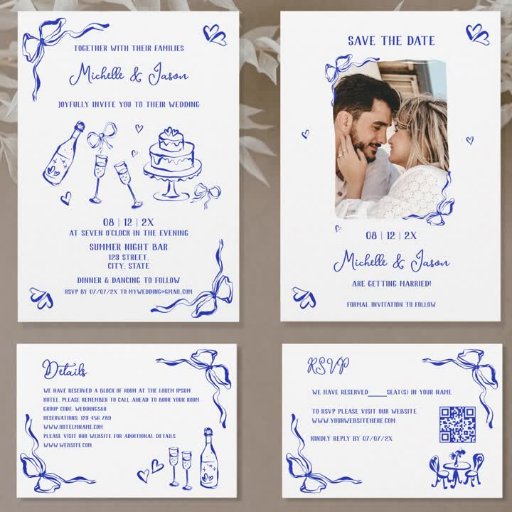 Einzigartig blauer Handgezeichneter Retro Französischer Spaß Einladung mit einem Bugrahmen, ein skurriles trendiges Kunstwerk für Ihre französische Hochzeit am Savanamm