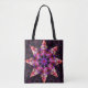 Lebhafte, sternförmige Formen, in einem lila und rosa Spektrum, erzeugen eine abstrakte und dynamische Komposition, die Bewegung und Energie suggeriert. Die atemberaubende Einkaufstasche.