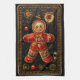 Einer der abstrakten, einzigartigen, roten und goldfarbenen Lebkuchenmänner, der in der Küche für tolle Kommentare aufhängt