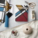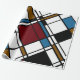 Modernes geometrisches Muster in Farbkombination von dunkelrot, schwarz, weiß, blau und Senfbraun.