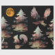 Eine Wildnis wird in einzigartigen Braunen, Grüntönen und Orangen in den Formen von Nadelbäumen dargestellt. Ein heller orangefarbener Mond in einem schwarzen Himmel erhellt künstlerische Bäume, Adler, Kaninchen und Eichhörnchen, die alle durch Reihen von Nadelbäumen geformt sind.
