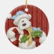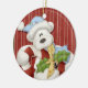 Ein Eisbär mit einem großen, rot-weißen Bonbons auf einem rot gestreiften Hintergrund, der die Urlaubssornamente bewahrt.