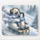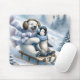 Ein Eisbär und ein Pinguin schweben fröhlich auf einem schneebedeckten Hügel, gebündelt in gemütlichen Schals und Ohrmuffen