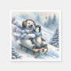 Ein Eisbär und ein Pinguin schweben fröhlich auf einem schneebedeckten Hügel, gebündelt in gemütlichen Schals und Ohrmuffen