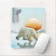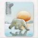 Ein gut aussehender Polar-Bär jagt über die schmelzende arktische Tundra. Ein amerikanischer Totem-Pole beobachtet ihn.
