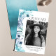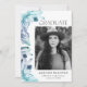 Erzählen Sie Ihren Abschluss mit unseren stilvollen und modernen Foto-Graduierungsankündigungen. Das Design ist mit einem Rahmen von bemalten Aquarellkristallen in den Farbtönen von eisblau und lila. "Graduate" wird in einem modernen schwarzen Serif-Schriftart angezeigt. Personalisieren Sie die einmalige Ankündigung des Abschlusses, indem Sie Ihr Foto, Ihren Namen, den Namen der Schule und das Abschluss Jahr hinzufügen. Die Karte kehrt zurück, um einen schönen blauen Aquarellhintergrund anzuzeigen.