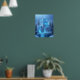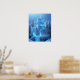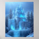 Poster eines magischen Schlosses ganz aus Eis. Ein tiefgefrorener Wasserfall fällt von den Fundamenten der Halbinsel ab, um am Ende zu den Eiskeln zu werden. Kiefernbäume flankieren die Burg, während die Sonne durch das Eis bricht und wunderschöne blaue Lichter erzeugt, die aus dem Herzen des behaltend zu kommen scheinen.. vielleicht die gefrorenen Träume, die versuchen, sich frei zu machen. Das Bild wurde mit Leonardo.ai erzeugt und von mir verändert.