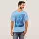 T - Shirt eines magischen Schlosses ganz aus Eis. Ein tiefgefrorener Wasserfall fällt von den Fundamenten der Halbinsel ab, um am Ende zu den Eiskeln zu werden. Kiefernbäume flankieren die Burg, während die Sonne durch das Eis bricht und wunderschöne blaue Lichter erzeugt, die aus dem Herzen des behaltend zu kommen scheinen.. vielleicht die gefrorenen Träume, die versuchen, sich frei zu machen. Das Bild wurde mit Leonardo.ai erzeugt und von mir verändert.