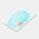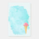 Ein Yummy-Pad mit großen, klebrigen Noten und einer köstlichen Eis-Creme-Illustration, mit einer Kugel aus rosa Erdbeereis, das von einem Waffelkegel gehalten wird. Set auf einem Aqua Blue Aqua Aquarell Farbe Spritzer / Pinselstrich.