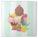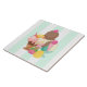 Eine Keramik, illustriert mit einer Schüssel Eis mit 3 köstlichen Kugeln mit Süßwasser-Sprinklen. Eine Eistüte mit 3 Düsen Schokolade, Vanille und Erdbeere. Eine Dessertschale gefüllt mit neopolitischem Eis mit einer köstlichen Kirsche. Ein Muster aus grünen und weißen Streifen im Hintergrund.