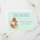 Save the Date flache Karte illustriert mit zeichn eines 3 Scoop Eis Sundae mit bunten Sprinklen. Eine Eistüte mit Schokolade, Erdbeere und Vanille. Eine Schüssel mit neopolitischem Eis und einer Kirsche auf der Oberseite. Erdbeeren und Ananas stehen neben den Schalen. Summerisch und süß.