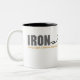 Weiße Tasse mit schwarzem Innenraum und Eisen stef Logo.