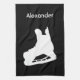 Schwarz-Weiß-Hockey-Skate Handtuch - ein nützliches Geschenk für Hockeyspieler, da es wichtig ist, die Klingen nach dem Training zu trocknen.Farbe: weiß auf schwarzem Hintergrund.Design: Silhouette des Hockey Skate + personalisieren mit dem Namen des Hockeyspielers.