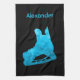 Türkisfarbenes personalisiertes Hockey-Skate-Handtuch - ein nützliches Geschenk für Hockeyspieler, da es wichtig ist, die Klingen nach dem Training zu trocknen.Farbe: Türkis auf schwarzem Hintergrund.Design: Silhouette des Hockey Skate + personalisieren mit dem Namen des Hockeyspielers.