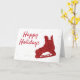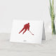 Senden Sie Ihre besten Wünsche an Spieler und Hockey-Fan mit einer Eishockey Weihnachtskarte. Vorderes Design: goldener Hintergrund mit Hockey-Skate im Roten Funkeln und "Happy Holidays" im Rot-Rücken-Design: Hockeyspieler im Roten Funkeln