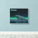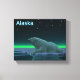 Ein friedlicher Moment in der langen arktischen Nacht. Ein Polarbär Erholungen am Rand eines offenen Bereichs im Packeis. Die Nordlichter leuchten in der Ferne; helle Sterne leuchten über dem Kopf. Der Text "Alaska" erscheint in leuchtendem Blau und Weiß. Eisbären sind gefährdet. Wie lange werden solche Szenen noch stattfinden können? Helfen Sie bitte, Polarbären vom Aussterben retten.