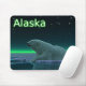 Ein friedlicher Moment in der langen arktischen Nacht. Ein Polarbär Erholungen am Rand eines offenen Bereichs im Packeis. Die Nordlichter leuchten in der Ferne; helle Sterne leuchten über dem Kopf. Der Text "Alaska" erscheint in grün und weiß. Eisbären sind gefährdet. Wie lange werden solche Szenen noch stattfinden können? Helfen Sie bitte, Polarbären vom Aussterben retten.
