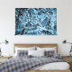 Ein nah-up Foto zeigt eine Sammlung von Eissplittern. Die Eisstücke sind in verschiedenen Formen und Größen gefertigt, wodurch eine strukturierte Oberfläche entsteht. Die Farbpalette wird von Blau- und Weißtönen dominiert, einige dunklere Bereiche sind unter dem Eis erkennbar. Das Bild erfasst die komplizierten Details und die kristalline Struktur des gefrorenen Wassers. Die allgemeine Stimmung ist kalt und knusprig.