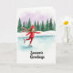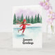 Auf dieser Weihnachtskarte gleitet ein hübsches Mädchen auf dem Eis, gekleidet in Rot und Grün. Sie trägt eine gestreifte Mütze und einen Schal, und die Szene sieht träumerisch und ruhig aus, mit Kiefern und Schnee. Der Himmel ist ein sanftes Rosa und das Mädchen läuft mit Freude auf Schlittschuhen. Unten steht in verschnörkelten Buchstaben "Season's Greetings". Diese Karte bringt allen, die sie sehen, Wärme und Freude und ist perfekt, um Weihnachtsfreude zu verbreiten! 🎅🏼🎄🎁