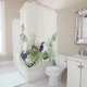 Wunderbare Collage der Vintagen botanischen feinen Kunst eines Eisvogelalcedo-Vogels und französische Kunst Nouveau der Vintagen botanischen Kunst von Cattails, mit Botanikanmerkungen auf französisch, einige Palmen-Wedel und Orchideen-Blumen, mit einem Hintergrund des Imitats Büttenpapier, ist auf dieser Eisvogelvogel-u. Cattails-Duschvorhang.