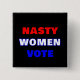 Politischer Knopf mit Textkunst "eklige Frauen wählen" in rot und blau.