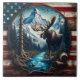 Ein Elch steht an einem klaren, blauen Bach, umgeben von majestätischen Bergen und Wäldern, mit einer amerikanischen Flagge, die sich subtil in die natürliche Szene integriert.