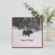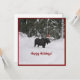Elche in einer Weihnachtsmannmütze im Schnee in der Nähe eines Waldes mit "Happy Holidays" Gruß auf der Vorderseite. Dies ist eine flache Karte, deren Rückseite leer ist, um sie anzupassen oder zu signieren.