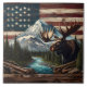 Ein großer Elch liegt in der Nähe eines Flusses, der von Kiefern und Bergen gerahmt ist und von der amerikanischen Holzflagge umgeben ist.