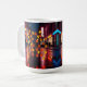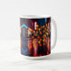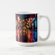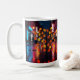 White ceramic mug with blazing neon orange and cool blue city bokeh, rain-slick reflections, full-wrap glossy urban night artwork.